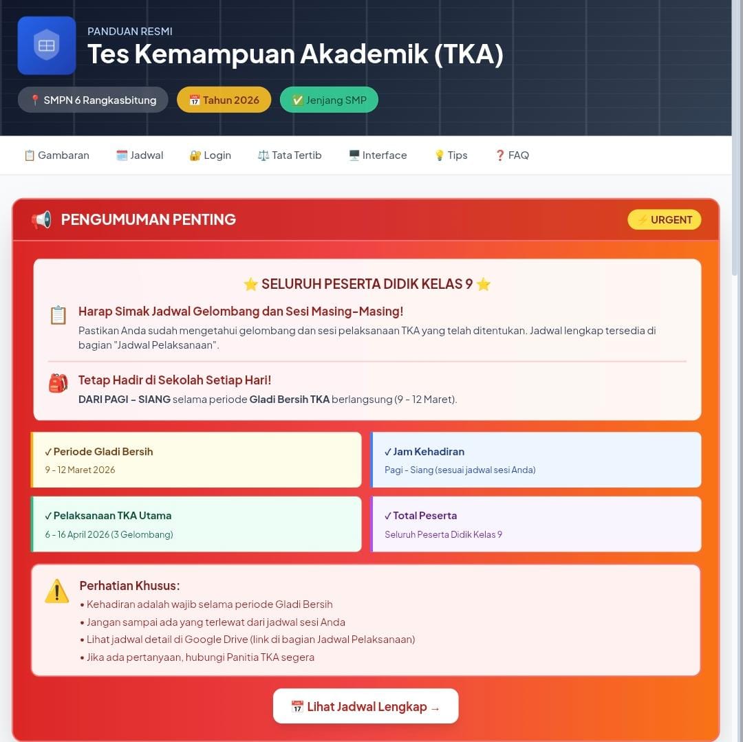 Dengan berbagai persiapan yang telah dilakukan, SMPN 6 Rangkasbitung optimis pelaksanaan Tes Kemampuan Akademik (TKA) Tahun 2026 dapat berjalan dengan lancar, tertib, dan sukses. Diharapkan melalui kegiatan ini, kualitas pembelajaran dan prestasi akademik peserta didik dapat terus meningkat di masa yang akan datang.